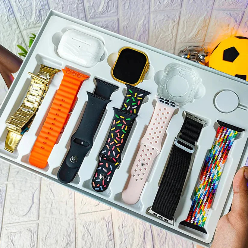 10 in 1 Smart Bluetooth Calling Smartwatch with Earphones Transparent Screen Guard and 7 Classic Straps (Mix Color)