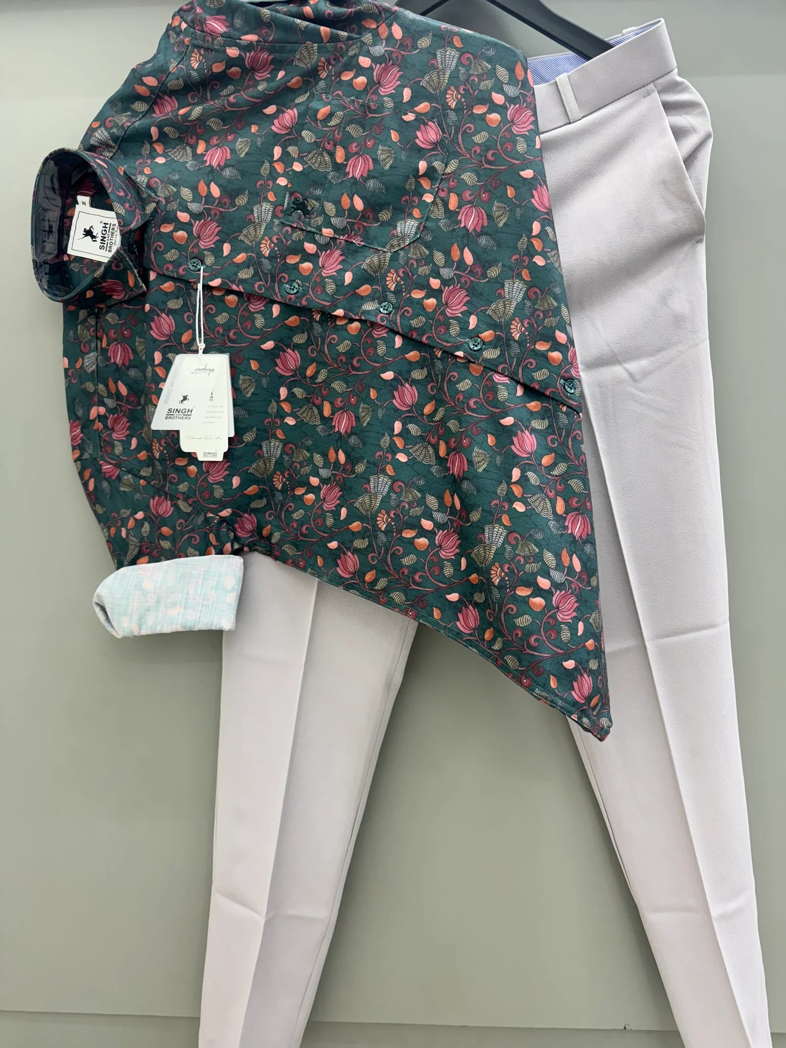 Comfortable men’s two piece outfit with green flower Arabic printed shirt and pale gray pant is designed for versatility. The shirt can be paired with other trousers or jeans, while the pale gray pants can be matched with plain or patterned shirts, allowing multiple outfit options from a single set.
