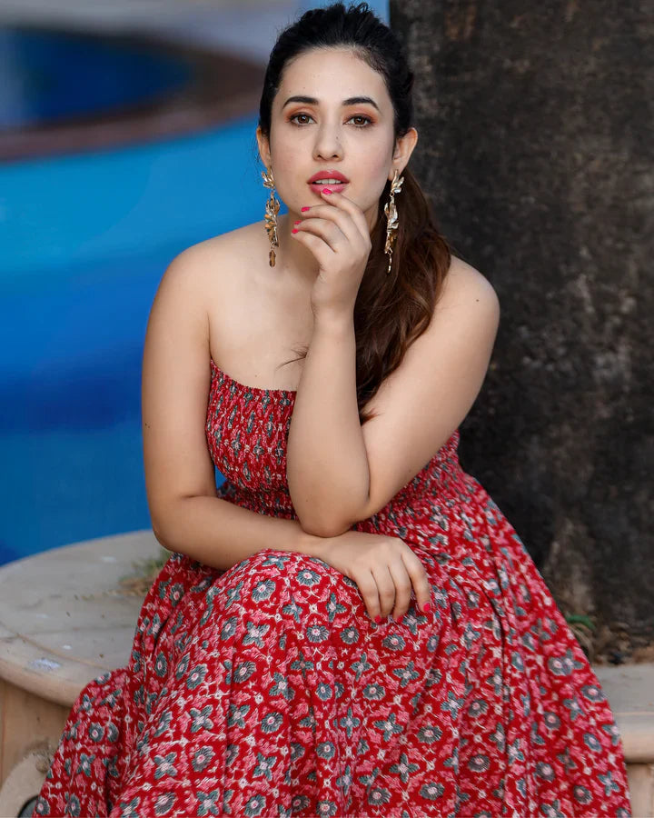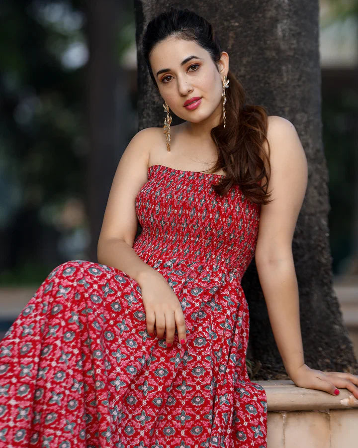 Styling the Elegant Smocked Cotton Dress is effortless due to its versatile design. For a casual day look, pair it with flat sandals or sneakers and a simple crossbody bag. To elevate the outfit for a semi-formal outing, add wedges or block heels along with statement earrings or layered necklaces. A denim jacket or light cardigan can be layered for cooler weather or a more refined appearance, giving the dress multiple styling possibilities while keeping the comfort intact.