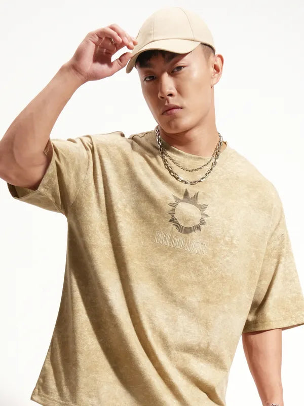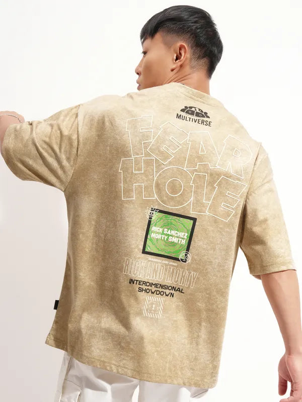 Men’s Khaki Oversized T-Shirt with Rick and Morty Graphic Print and Round Neck