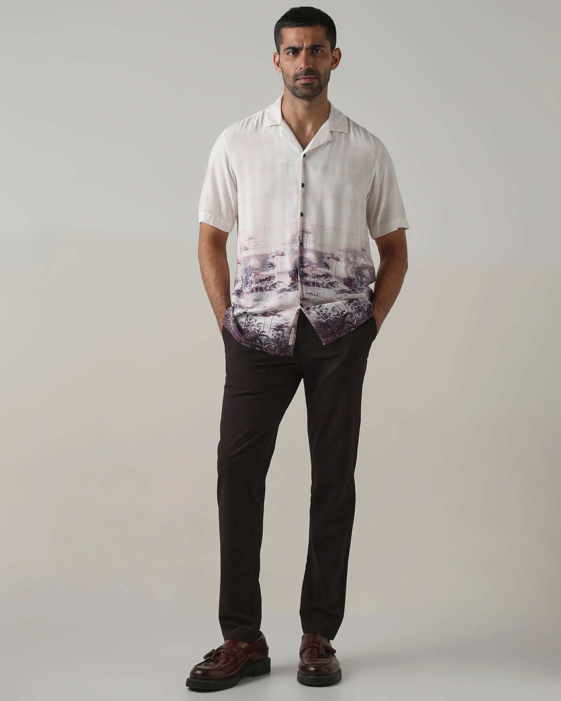 Relaxed Fit Shirt for Men with Off White Resort Inspired Print complements a variety of styles and accessories. It pairs well with loafers, sneakers, or sandals, allowing you to create multiple casual outfits effortlessly. The neutral off-white base ensures easy coordination with different colors and prints, giving you endless styling options.