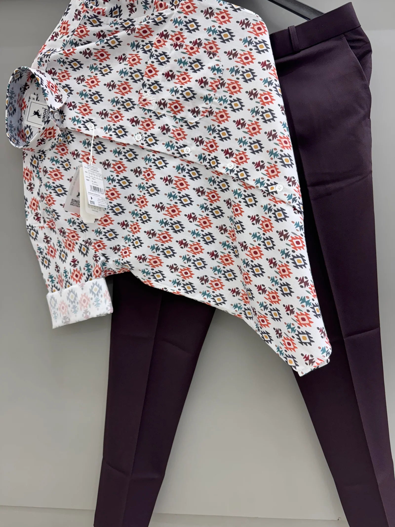 Stylish men’s office ready combo with white orange dot printed shirt and maroon pant highlights attention to detail and fine craftsmanship. The shirt features neatly finished collars, cuffs, and buttons, while the pant is tailored with precise hems and a structured waistband, ensuring a polished and high-quality appearance.